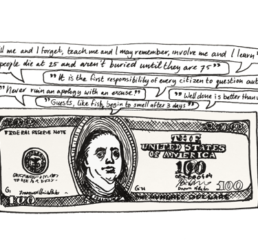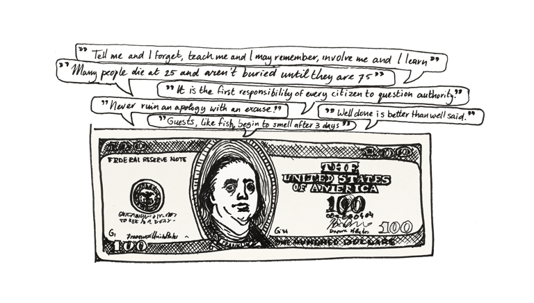 Een ander boek waar hij enthousiast over is: de biografie over Benjamin Franklin. Ik ken Benjamin Franklin als die belangrijke Amerikaanse staatsman die op een van de dollarbiljetten staat. That’s it zo’n beetje. Geen idee wat hij gedaan heeft. Dan vertelt m’n broer me de ene na de andere grappige anekdote over hoe slim, maar ook lekker eigenwijs Franklin was. En wat hij zoals was in z’n leven (toonaangevend auteur, drukker, politiek theoreticus, politicus, vrijmetselaar, baas van de postdienst, wetenschapper, uitvinder, burgeractivist, staatsman en diplomaat). Welke dingen Franklin heeft uitgevonden (zoals een bliksemafleider; hij heeft met een vlieger geprobeerd bliksem te vangen. En dat is gelukt). En over sterke quotes van hem zoals: