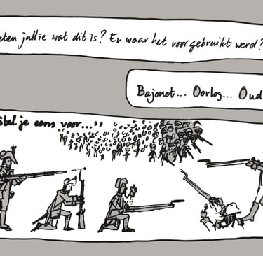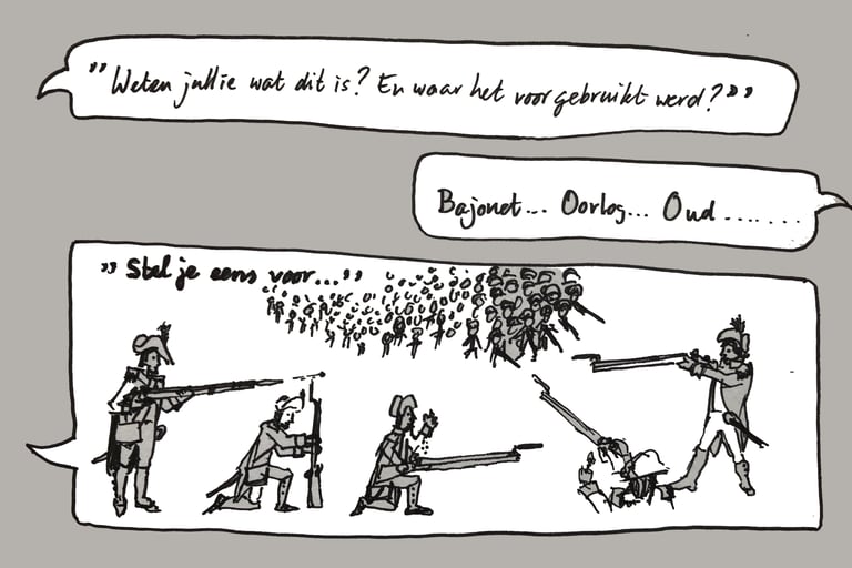 Nog zoiets moois: Laatst was hij met zijn kinderen bij een museum. Daar stond een bajonet. Er stonden wat jaartallen bij. Ze keken even en liepen al snel weer door. Hij riep z’n kinderen terug. “Weten jullie wat dit is? En waar dat voor gebruikt werd?”. … Brave antwoorden: “Musket. Bajonet. Oorlog…”. “Moet je eens voorstellen. Je bent soldaat. Aan de overkant van het grote veld staat het enorme leger van de vijand. En dan gaat het signaal van de trompet en komen ze op je afgelopen. Jij staat paraat. Je musket is geladen. Ze komen binnen bereik en… Je schiet. En dan… Moet je je musket opnieuw laden! Want musketten kun je niet ff makkelijk herladen zoals geweren van nu! Dus snel schoonmaken met een speciale stok. Kruit uit het zakje aan je gordel pakken. Erin proppen. Kogels erin. (Hij begint steeds gehaaster te praten, leeft zich opnieuw helemaal in in z’n verhaal.) Zit de lont nog goed? Ja. O shit wat zijn ze al dichtbij! Snel aansteken! Waar is m’n vuur (ze hadden nog geen aanstekers)?! Steeds zenuwachtiger en onhandiger word je. Je vijand is nu echt dichterbij. O je! Zou het vuur op tijd bij het kruit komen? Zou je musket z’n kogels afschieten voordat jij aan de bajonet van je vijand wordt geprikt?” Z’n kinderen hadden ogen vol spanning en enthousiasme, stelden de ene na de andere vraag. Want nu lééfde dat verhaal van die musketten voor ze. Voelden ze mee hoe het was om die dingen te gebruiken. Vóelden ze de geschiedenis.