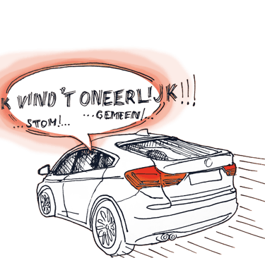 Zijn boosheid vult de auto. Elissa schrikt. En eerlijk gezegd: ik ook.