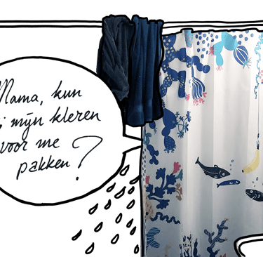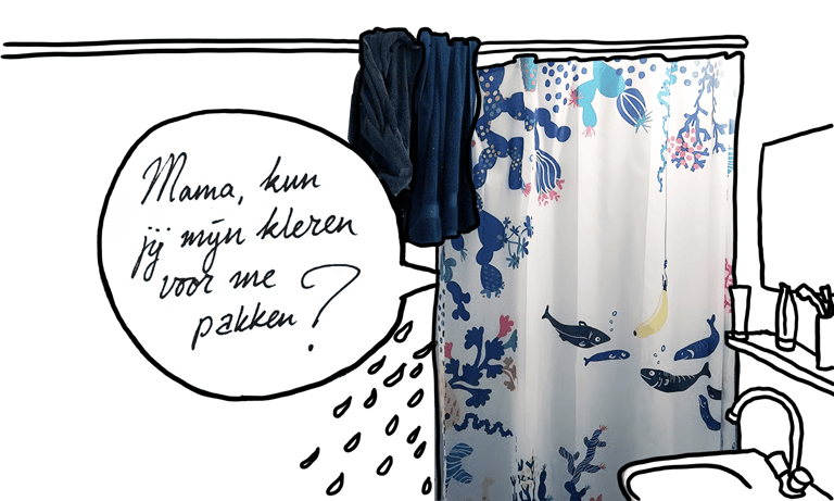 Ik schreef het al eerder: ik geloof in lange-termijn-ouderschap. Dus niet automatisch kiezen voor de oplossing waarbij jij het probleem van je kinderen nú voor hen oplost. Maar kiezen voor de oplossing waar ze zelf het meeste van leren, en waarbij hun gevoel van zelfstandigheid en zelfvertrouwen groeien. Daar valt ook onder: zelf eraan leren denken je ondergoed en kleren te pakken vóórdat je gaat douchen.