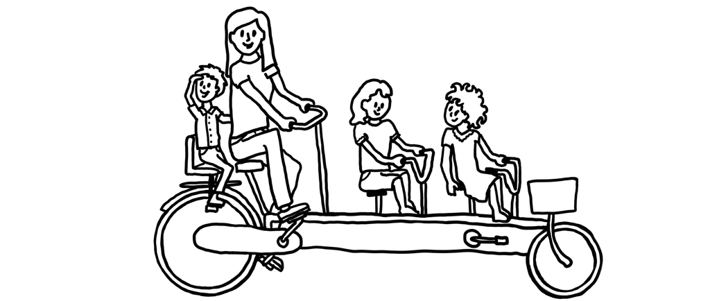 “Zoals die keer dat ik 5 jaar ofzo was en we samen met Mees (onze buurjongen) en Roza (ons buurmeisje) én Milan naar de dansles gingen. Toen hadden we net onze kindertandem (een superleuke Onderwater tandem waar een kind voorop zittend mee kan trappen en een tweede kind tussen het stuur en de volwassene in zit op een extra zadeltje. Bovendien hadden we een bak voorop waar ook nog een kleuter in paste én een zitje achterop). Zo hadden we op één fiets plek voor 1 volwassene plus 3 kinderen - en voor kleine stukjes zelfs 4 kinderen.