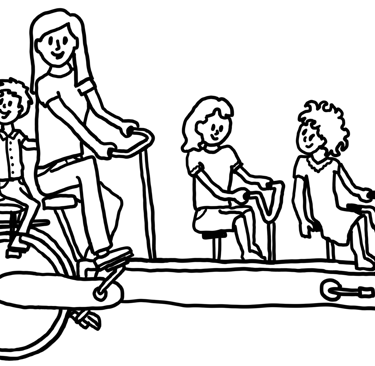 “Op de heenweg mochten Mees en Roza kiezen waar ze wilden zitten, op de terugweg Milan en ik. De leukste plek vonden we het extra zadel, want dan kon je lekker achterstevoren tegen jou aan zitten knuffelen of vooruit kijken en hoefde je niet te trappen. De tweede leukste plek was waar je mee kon trappen. Voorop in de fietsmand was grappig, maar achterop saai, want je kon daar niets doen en bijna niets zien. Helaas had Mees op de terugweg de laatste keus en kreeg hij de plek die over bleef. Dat werd achterop zitten. Dat vond hij zo stom dat hij niet op wilde stappen.”