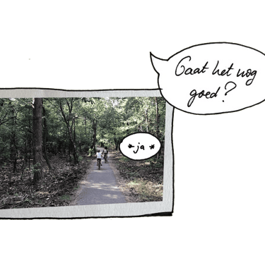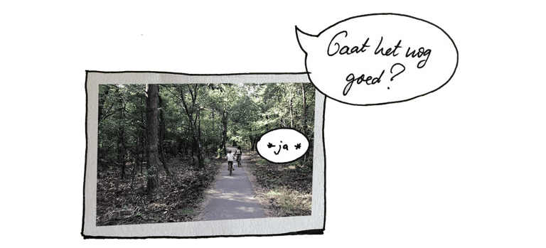 Aan Elissa’s fietshouding zie ik ook nu – of nee: ik denk te zien – dat ze weer in zo’n situatie zit: te volhardend en koppig om om hulp te vragen, maar eigenlijk wil ze wel geduwd worden. Ik sta op het punt om de anderen in te halen en naar haar toe te fietsen en te helpen, als opa aan haar vraagt of het goed gaat met fietsen. Ze knikt kort ‘ja’ (meestal als het echt goed gaat zégt ze “ja”, als ze ‘ja’ knikt, is het meestal eigenlijk een “nee”), en fietst stilletjes door. Ik voel m’n moederhart naar haar uitgaan, maar bedenk me ineens: het is zoveel waardevoller voor haar als ik haar kan leren haar behoeftes uit te spreken en om hulp te vragen in plaats van in deze modus te blijven waarin zij verwacht dat anderen wel aanvoelen wat ze nodig heeft en dat uit zichzelf geven. Dus ik hou me in, met heel veel moeite, en blijf fietsen waar ik fiets. Zowel opa als oom vragen haar nog een aantal keren of het gaat en of ze hulp nodig heeft, maar het antwoord blijft geknikt, en ze fietst koppig door.