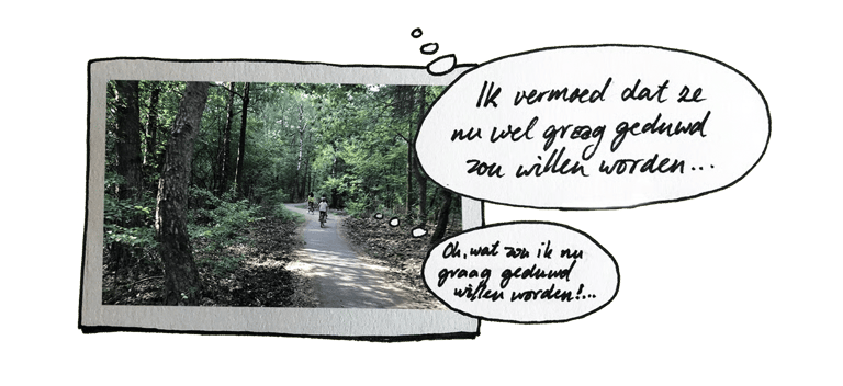 Een stukje verderop stop ik even om mijn jas op m’n bagagedrager te doen. Het is na weer een verkoelende regenbui ineens veel te warm met een regenjas aan. De twee tandems uit ons gezelschap halen mij in en ik fiets vervolgens achteraan. Ik ben nu een stuk achter Elissa en vraag me af of ze moe aan het worden is of dat ze een duwtje nodig heeft. De fietstocht terug is langer dan verwacht en ik vermoed dat Elissa er wel een beetje klaar mee is. Mijn moederhart wil voor haar zorgen, de anderen inhalen, en haar duwen. Maar dan herinner ik me ineens een andere fietstocht, waar ik haar meermalen vroeg of ze geduwd wilde worden, ze steeds “Nee” zei, en ze bij thuiskomst boos was, omdat ik haar niet had geduwd toen ze het op een gegeven moment wél wilde. Ik had haar toen gevraagd waarom ze dat dan niet vroeg; “omdat ik boos was op je! Omdat je Milan de hele tijd duwde en dat vond ik niet eerlijk!” “Ah, dus je voelde 90% dat je niet geduwd wilde worden omdat je boos was, maar 10% van je wilde stiekem toch wel geduwd worden?” Ze keek naar me op met een gezichtje vol tranen en dankbaarheid, omdat ik haar had begrepen en haar had geholpen zelf te snappen dat je meerdere gevoelens tegelijk kunt voelen, hoe verwarrend dat is en dat je daar wijs uit kunt worden.