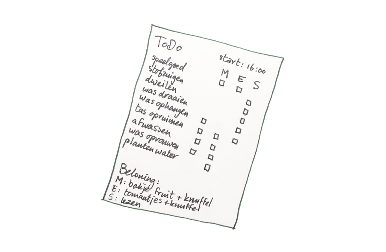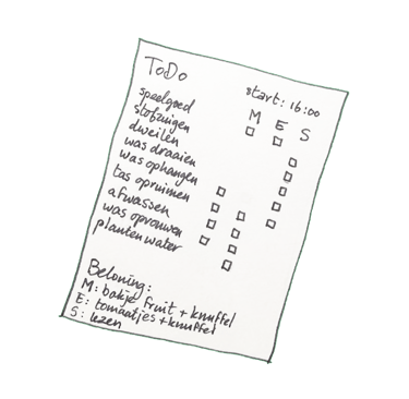 We lopen samen het huis een beetje rond. “Oja, we moeten ook afwassen.” En we komen nog een paar klusjes tegen. Ik maak een lijstje, vraag ze wie wat wil doen, we verdelen de klusjes en maken aanvinkhokjes.